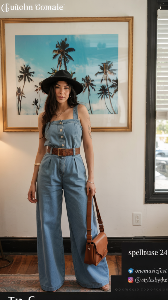 This wide-leg denim jumpsuit is basically a denim co-ord set cheat code—one piece, and you’re done. The fitted bodice, button front, and dramatic wide-leg pants create a long, uninterrupted line, while the wide-brim hat and leather belt add a touch of Western charm. It’s relaxed enough for a weekend brunch but pulled together enough to feel intentional, especially when you’re traveling or heading to a casual event where you still want to be the best-dressed in the room.