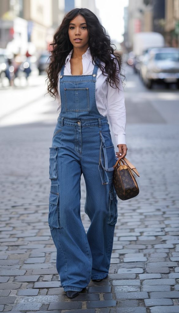 This look proves that overalls have grown up beautifully for women. The structured bib front paired with dramatic wide legs and cargo pockets feels modern and powerful, especially with a sharp white shirt underneath. It’s a fresh twist on 90s workwear—functional, a little nostalgic, but completely ready for today’s busy city streets. The overall effect is confident and playful, like you could head to a casual meeting or brunch without changing a thing.