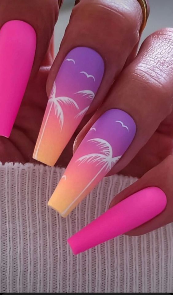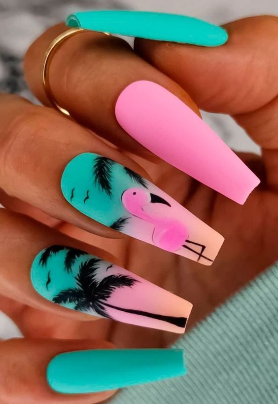 Nothing says summer quite like a set of nails painted with a tropical sunset and a silhouette of palm trees. The addition of a playful pink flamingo on a turquoise backdrop instantly conjures images of beach vacations and perfect summer nails 2024.