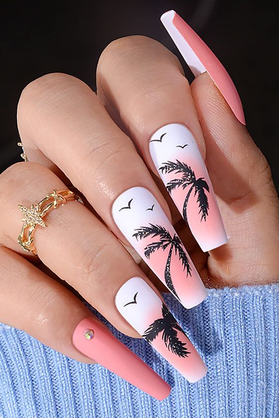 Embrace the tropical vibe with nails that feature palm trees, ocean waves, and sunset hues. It’s like having a little piece of paradise at your fingertips.