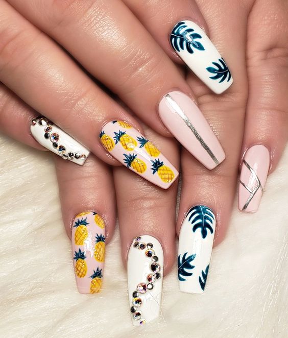 Transport yourself to a tropical paradise with nails that feature vibrant pineapples and cool palm fronds. These coffin-shaped nails represent the perfect nails for summer, blending playful patterns with stylish shapes to match any summer adventure.