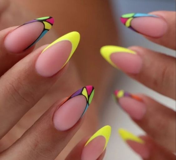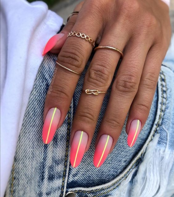 For those who love to combine classic designs with a pop of color, these nails feature striking neon stripes over a soft pink base, creating a look that is both eye-catching and undeniably perfect summer nails bright.