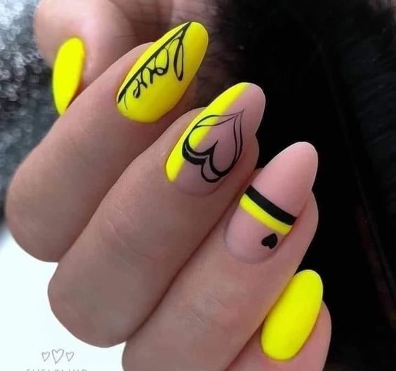 Yellow is the color of sunshine, and these nails do not shy away from making a bold statement with a vibrant shade of yellow complemented by minimalist black designs for a chic and perfect summer nails short look.
