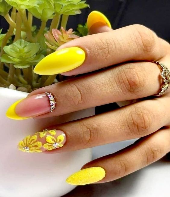 Almond nails are the epitome of femininity. Adorning them with delicate floral designs in soft pastels or vibrant hues can add a touch of elegance to any summer outfit.