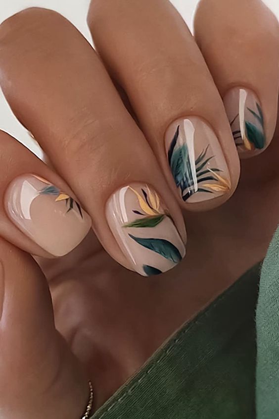The first look captures the essence of a summer garden with delicate perfect summer nails short. The botanical art, intricately painted on a nude base, whispers of serene summer days. These nails are not just a look but a narrative of nature’s silent bloom, perfect for those who appreciate a touch of sophistication.