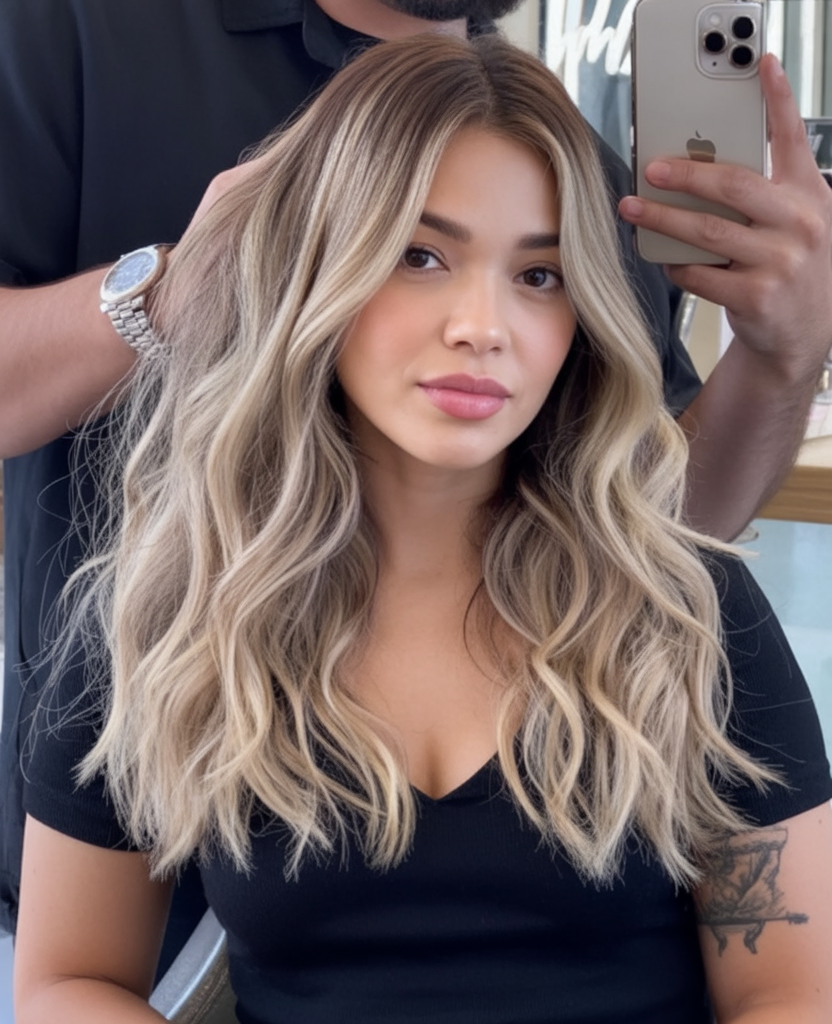 Despite the luxe finish, this look can be surprisingly low-maintenance. The color is built on soft blonde highlights and lowlights that grow out gracefully, so you’re not tied to constant root touch-ups. Ask for balayage that keeps the root slightly darker and concentrates brightness through the mids and ends. At home, you can refresh the waves with a few heatless blowout curls or a large-barrel iron, then mist with a light texturizing spray. It’s an easy routine that still gives you that polished, put-together payoff.