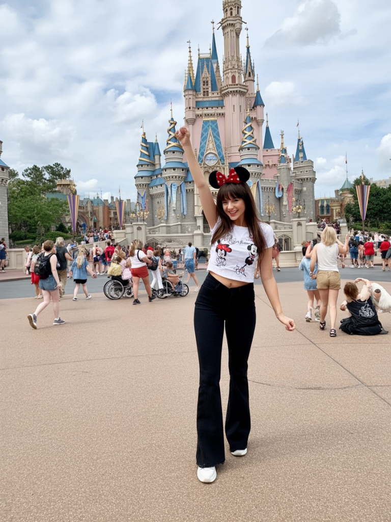 There’s a retro spark in this outfit—the cute Minnie crop top, the flared black pants, and the joyful pose that absolutely screams excitement. It feels fun and slightly throwback, like something you’d wear on a carefree, comfy summer park day full of rides and laughter.