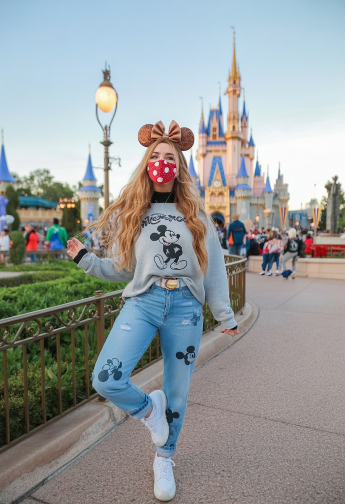 This outfit captures that magical winter Christmas park feeling—bundled just enough to stay cozy, but still playful and fun. The soft grey sweatshirt with the classic Mickey print feels nostalgic, while the dotted mask and warm-toned Minnie ears add a festive touch. It’s the kind of look that makes you want to wander slowly and soak up every castle moment.