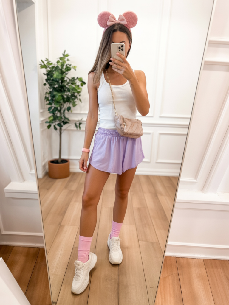 If you’re someone who enjoys quick, no-fuss outfits, this one is wonderfully low-maintenance. The tee and skort combo is easy to throw on, comfy for all-day walking, and ideal for December or warmer February trips when bright colors feel extra refreshing. It’s an easy win for summer casual dressing at the parks.