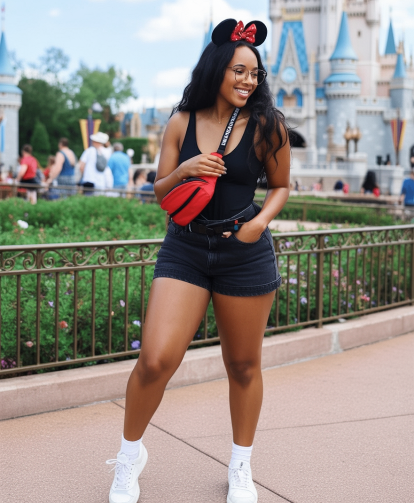 This look is pure joy from top to bottom—the kind of fun, whimsical outfit that instantly makes strangers smile at you. The bold polka-dot bow at the waist is such a charming twist, turning a simple black tank and shorts into a standout Disney ensemble. It’s playful, bright, and perfect for a carefree park stroll.