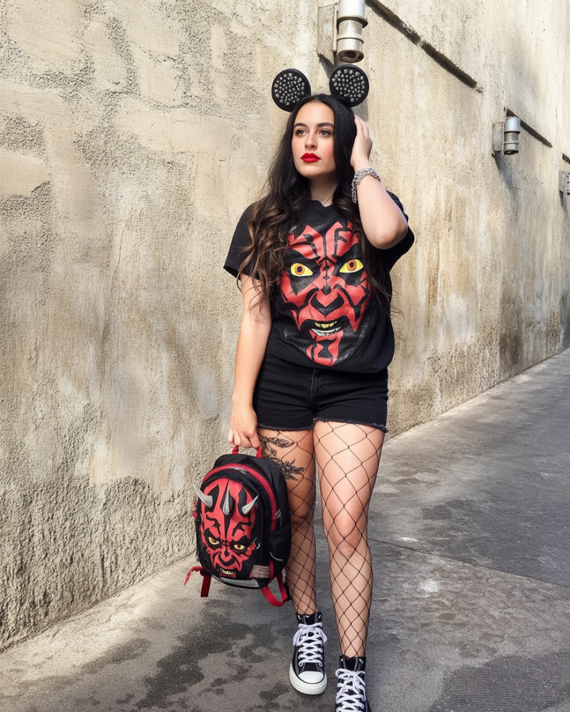 This bold Star Wars outfit is perfect if you want something with a little edge while still keeping that unmistakable Disney spark. The striking graphic tee, dark shorts, and fishnet tights create a fierce yet fun take on park fashion—ideal for those days when you want to stand out and channel your inner galactic warrior.