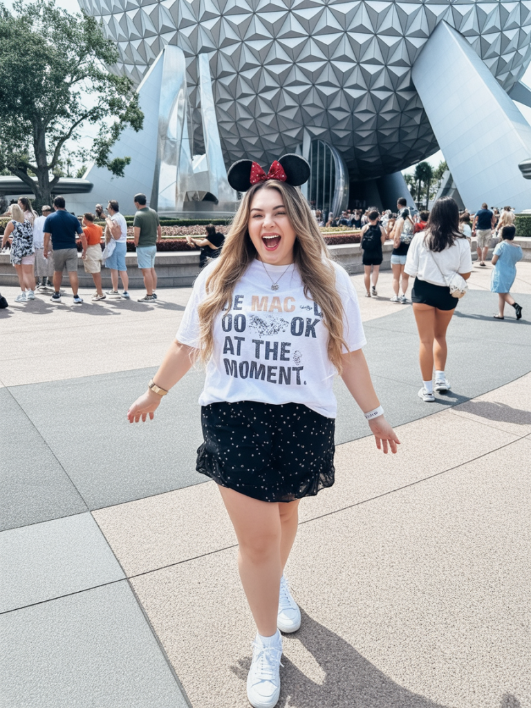 This look radiates pure joy—the kind of happy, spontaneous energy that happens when you hit Epcot bright and early and the whole day feels wide open. The sparkly Minnie ears, the fun black skort, and that witty tee all come together in a way that feels cheerful and full of personality. It’s playful without trying too hard.