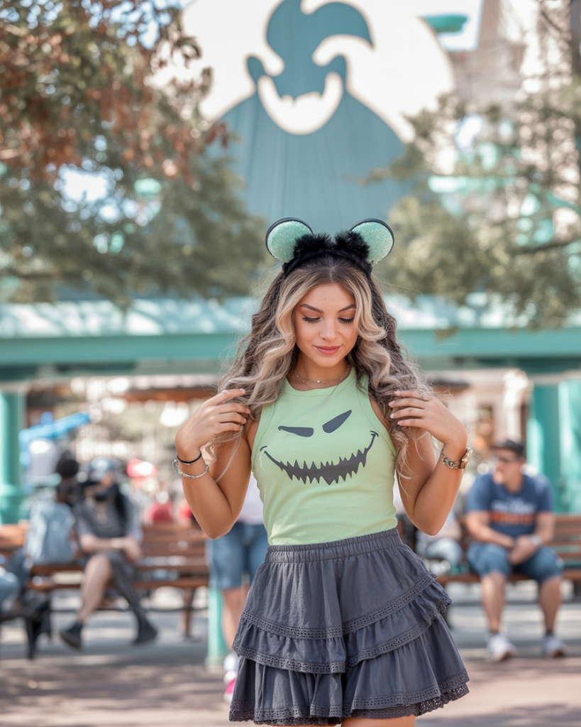 This outfit has that perfect Halloween twist—the neon green tank with the mischievous Oogie Boogie face, paired with a layered charcoal skirt that adds movement and charm. It’s spooky-cute in the best way, playful enough for park photos but still stylish enough for a full day of walking and exploring.