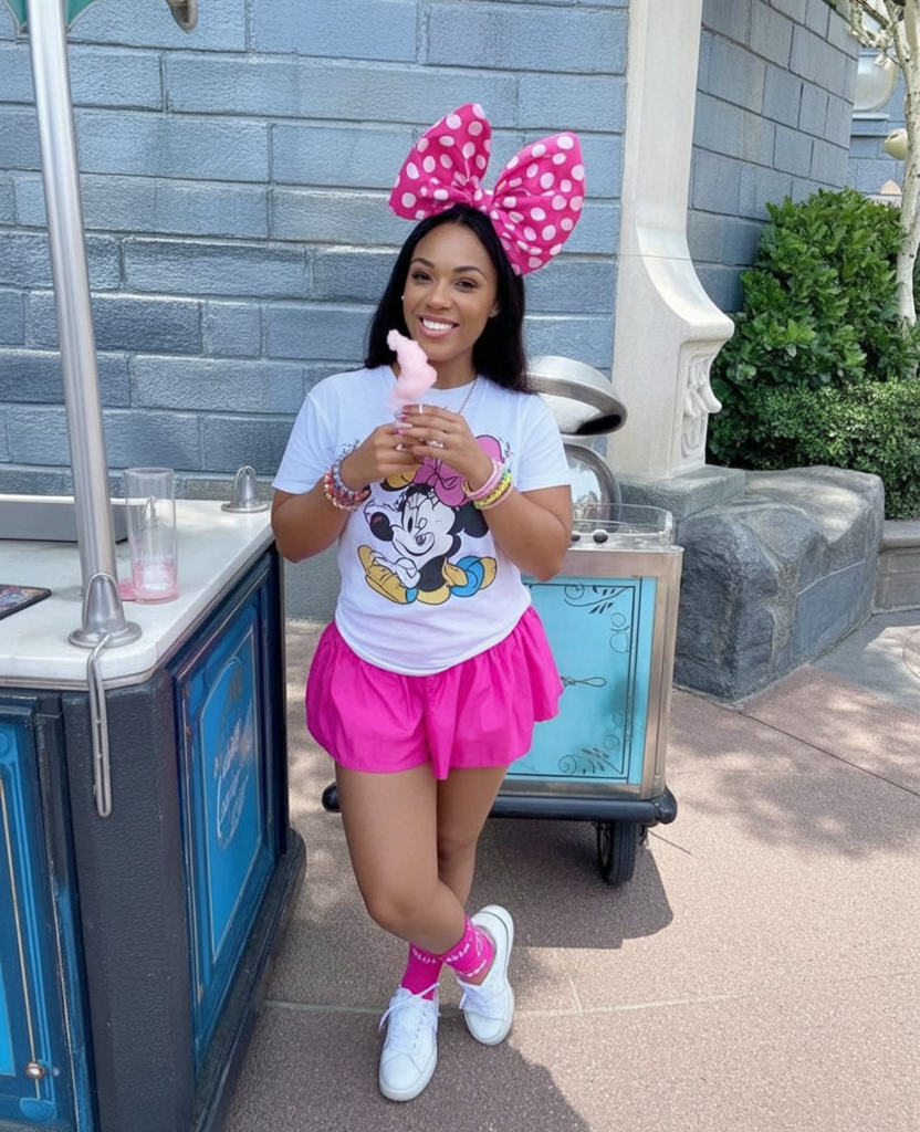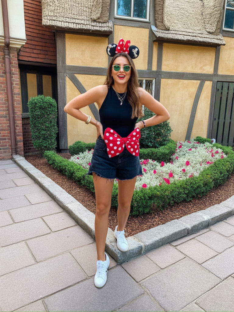 If you love accessories that steal the show, this outfit proves how transformative one statement piece can be. To keep it balanced, pair it with white sneakers and subtle jewelry. The emotional payoff is what really makes it shine—you can’t wear a big Minnie bow without feeling a little extra sparkle in your step.