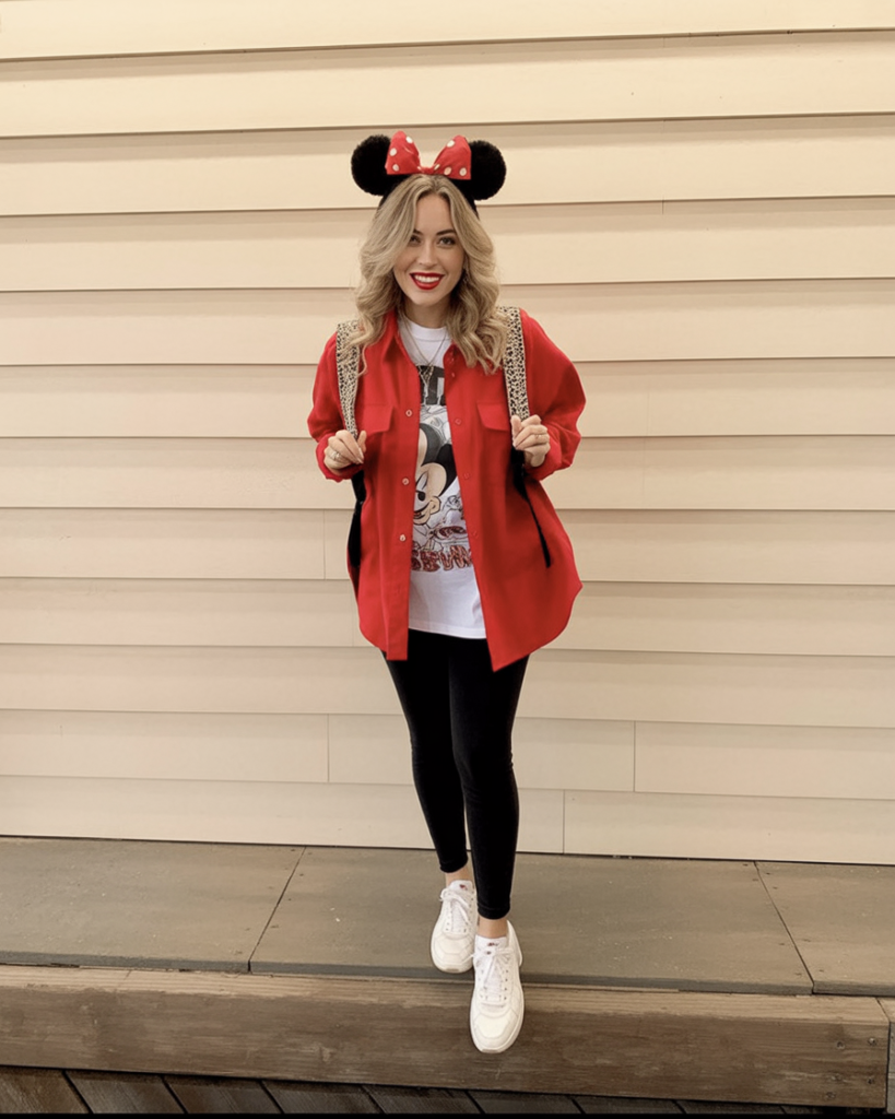 There’s something beautifully striking about the mix of red tones in this outfit—the bold cardigan, the bright lipstick, the polka-dot Minnie ears. It feels like a confident, slightly vintage nod to classic Disneyland glamour. Paired with sleek leather-look leggings, it brings a fresh twist that feels modern but still charming.