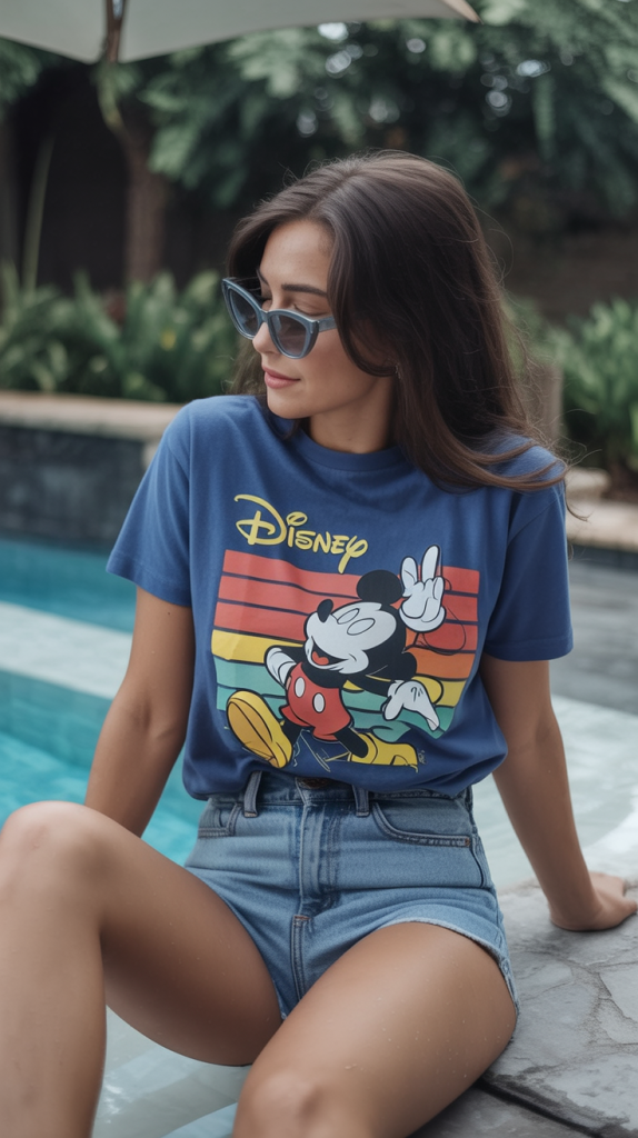 This outfit carries a fun vintage energy, the kind that makes you think of lazy summer mornings and the simple joy of slipping into a favorite graphic tee. The bold Mickey print feels both nostalgic and uplifting, and pairing it with denim shorts gives it that carefree summer comfy attitude—perfect whether you’re resort hopping or enjoying the poolside breeze.