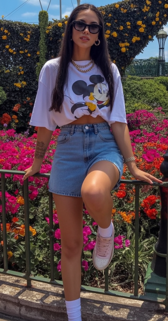 This look brings a softly rebellious twist to classic Disney styling, blending a slouchy cropped Mickey tee with high-waisted denim for a casual, confident feel. The bright florals in the background make the outfit pop even more, giving off a cool-girl park vibe that feels youthful without leaning into overly sweet territory.