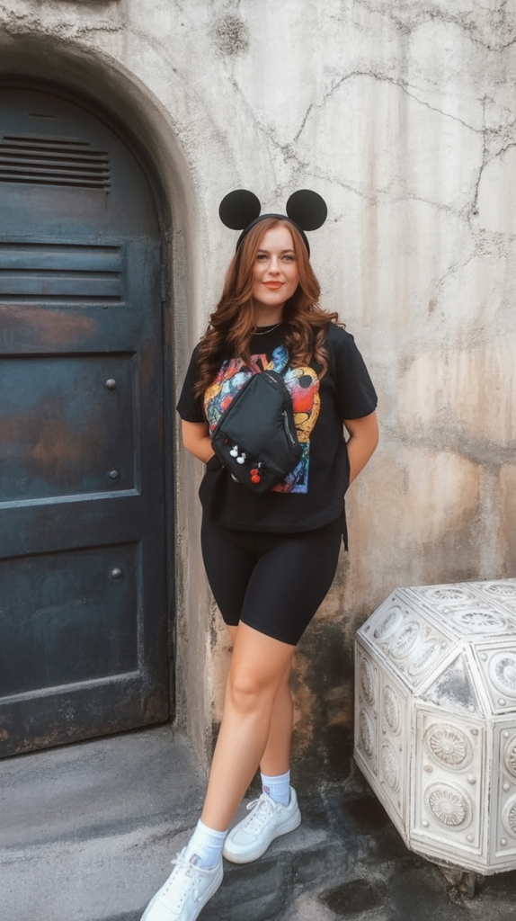 This look brings a little edge into Disney dressing—the all-black palette, the colorful Mickey tee, and the biker shorts give it a cool, confident attitude. It’s relaxed but bold, perfect for days when you want to channel a bit of Star Wars grit while still staying true to the magic.