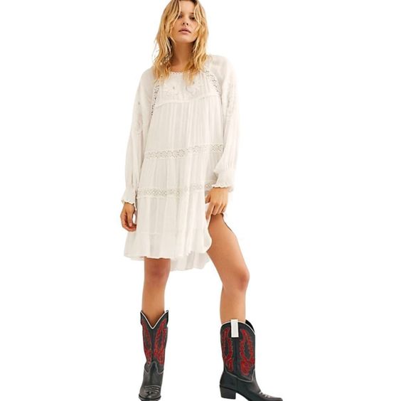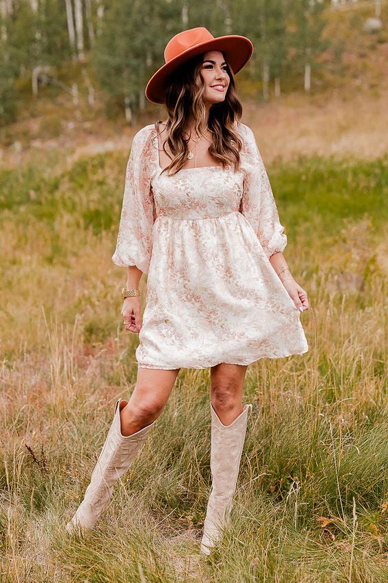 The peach blossom dress is a breath of fresh air for the spring season, radiating a soft, romantic vibe. The flowing sleeves and the flirtatious length make it a perfect dress with cowboy boots outfit for a concert or a casual day out. Pair it with cream cowboy boots to add a subtle country touch without overpowering the dress’s delicate features.
