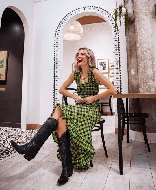 Embrace the countryside charm with a green plaid maxi dress. Match it with black cowboy boots for a stunning dress with cowboy boots wedding or a picturesque spring garden party look.