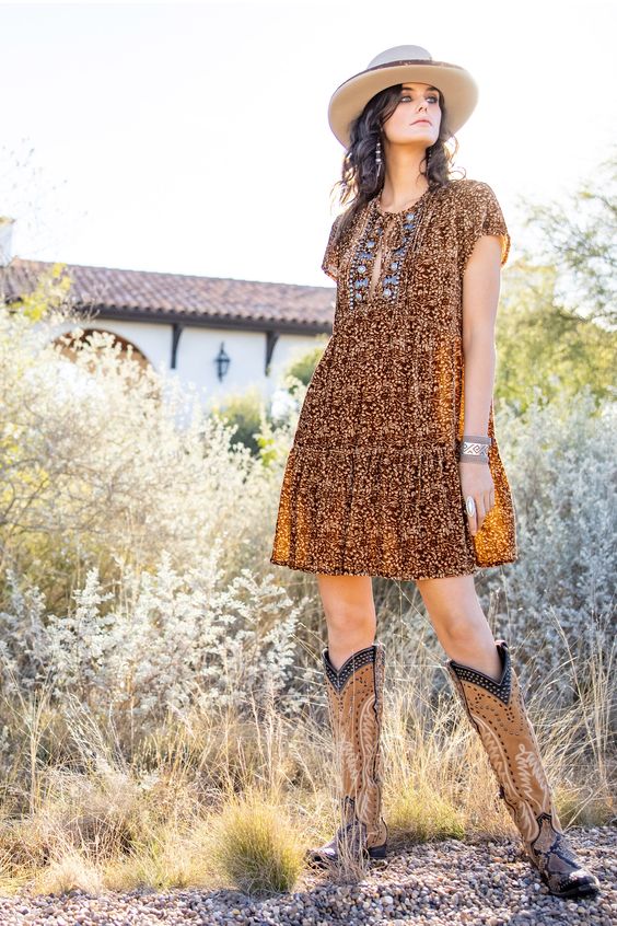 Stroll through the desert or a chic urban landscape in a brown printed dress. Paired with traditional cowboy boots, it’s a bold dress with cowboy boots mexican inspired look that’s perfect for any season.