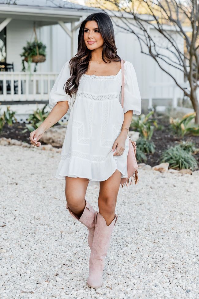 6. The Classic White: Lace Dress with Soft Pink Boots