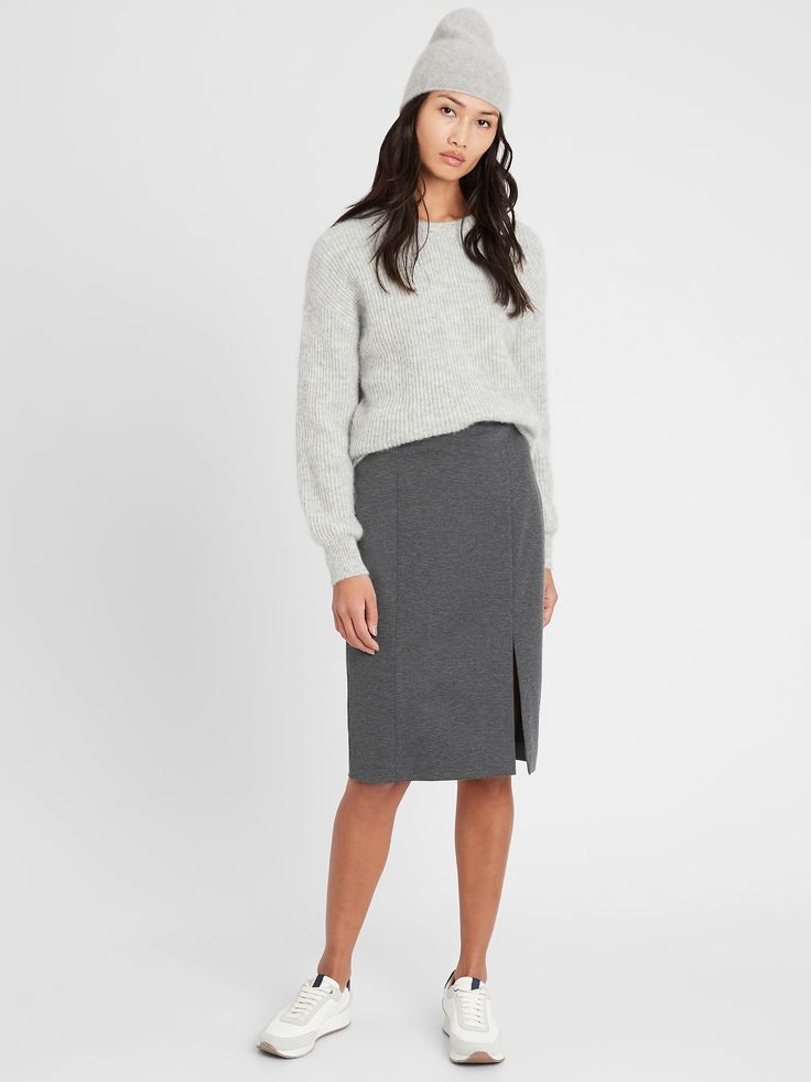 This outfit shows the power of simplicity with a structured white sweater and ribbed midi skirt. It’s a modern take on the dress with sweater over it trend that works for multiple occasions.