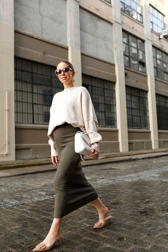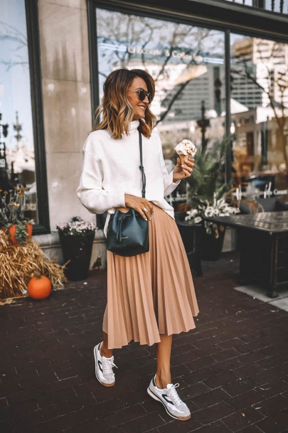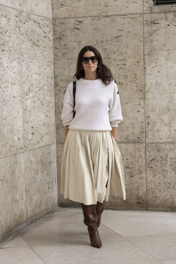 A creamy sweater paired with a pleated skirt exudes a kind of timeless class. It’s the go-to midi outfit for a woman who revels in understated beauty and can be dressed up or down depending on the occasion.