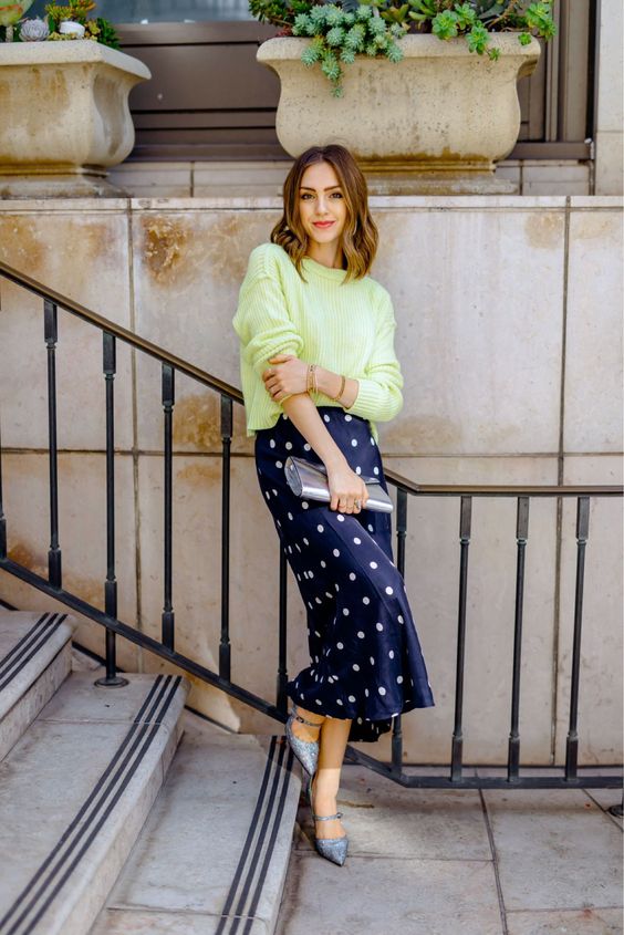 Combining a soft yellow sweater with a polka dot skirt offers a playful yet sophisticated vibe. It’s perfect for a dress with sweater over it spring look, complete with comfy heels for a touch of elegance.
