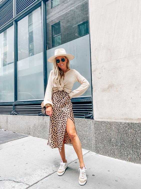 Embrace your wild side with a daring animal print skirt paired with a relaxed-fit sweater. This combination speaks to the bold dressers, unafraid to make a statement while strolling the urban jungles. Perfect for the dress with sweater over it fall outfits, it’s a testament to how pattern mixing becomes a form of self-expression.
