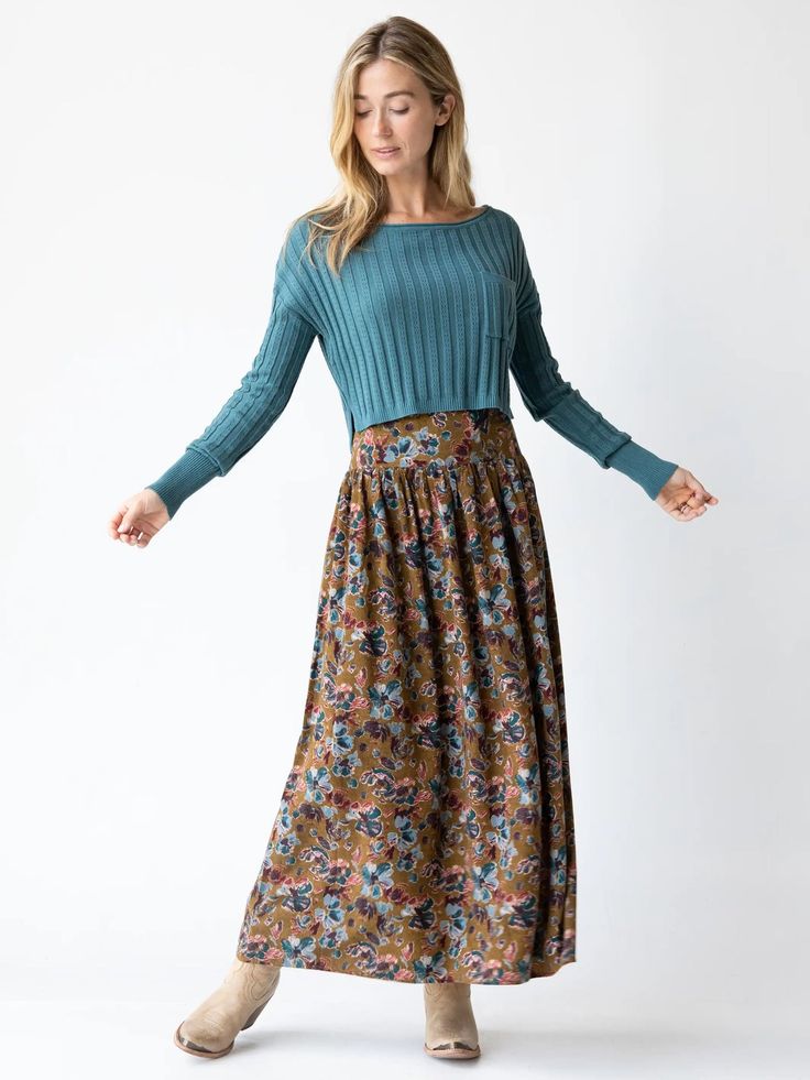 Channeling the depths of the ocean, a teal sweater paired with a floral maxi skirt is a match made in heaven. It’s a great way to incorporate color into your wardrobe, especially if you’re someone who usually sticks to black.