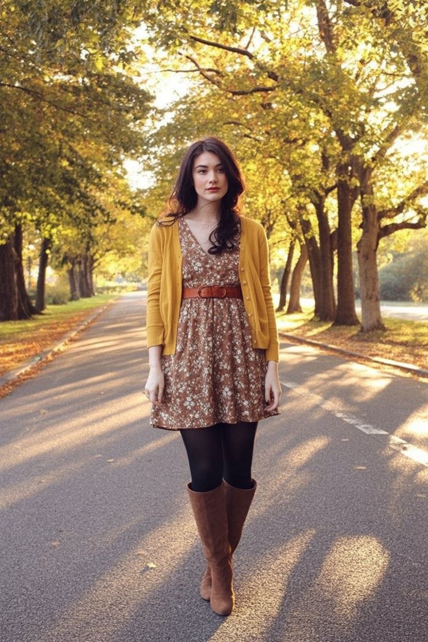 3. Golden Cardigan And Belted Floral Dress For Classic Fall Charm