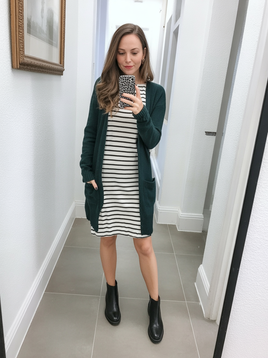 This look is the definition of “throw on and go.” A simple striped dress paired with a deep green cardigan instantly reads relaxed yet intentional, like you just stepped out for coffee but could just as easily head into a casual office. The stripes keep things playful, while the solid cardigan grounds the outfit so it never feels too busy.