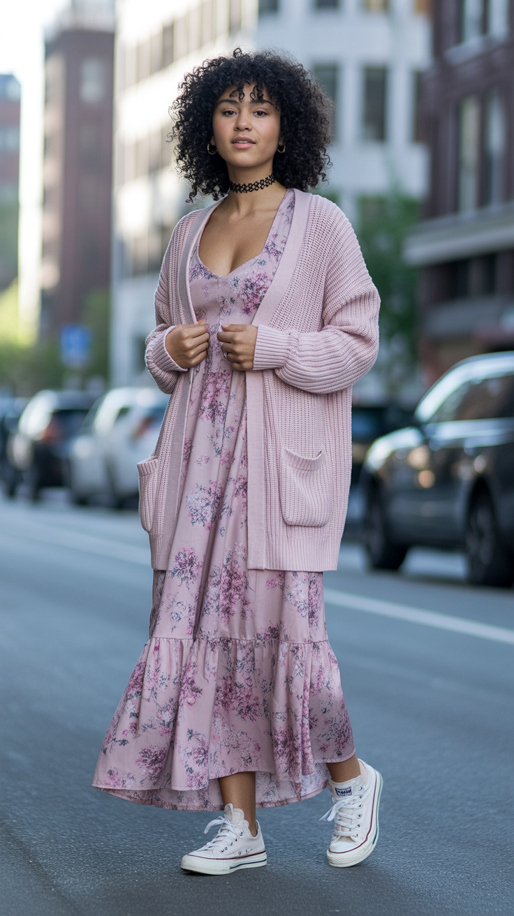 “This look is full-blown pink romance, yet with a relaxed, city-walkabout twist. A tiered maxi dress in a floral pattern with tiny, delicate blooms drifts with every move, while the thick, coordinating blush-colored cardigan envelops you in comfort. Paired with slacker sneakers, it’s like saying, ‘Yes, I’m feminine, but I’m also down to earth.’ It’s like something to wear while traipsing through an unfamiliar new ‘hood, meeting friends for Saturday brunch, or running errands.” In 2026, we’re also observing more women embrace flowy maxi dresses with sneakers over heels, and this look embodies those elements perfectly. It repurposes what could have been a really dressy pink dress into something you could wear every day while looking like you’re dressed to impress. The cardigan layers back some of the fullness from the dress, while the sneakers make it no concern to walk in all day. It’s a great way to incorporate trends while maintaining comfort and expressing yourself, too.