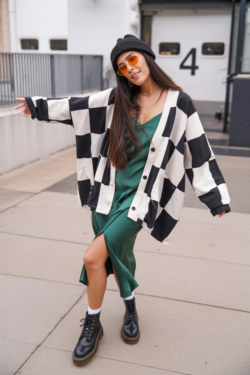 18. Checkerboard Cardigan And Green Slip Dress For Playful Street Style
