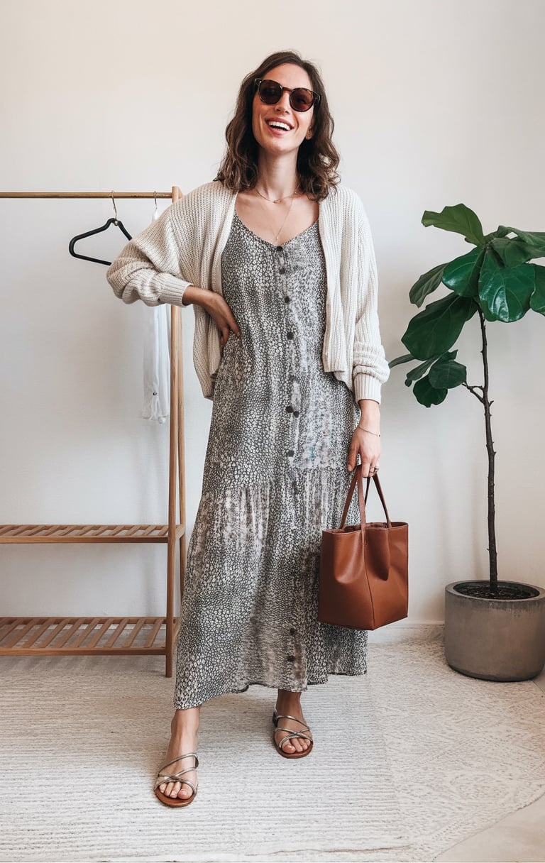 To style a similar outfit, focus on keeping everything light and fluid. Choose a midi or knee-length dress in a painterly print, then add a cardigan in one of the softer shades from the pattern so the whole look feels intentional. Slide-on sandals or espadrilles keep it comfortable, and bare legs or minimal jewelry make it feel effortless. If you run warm, push the sleeves up and opt for breathable fabrics; this way your summer outfit feels fresh even in the heat.