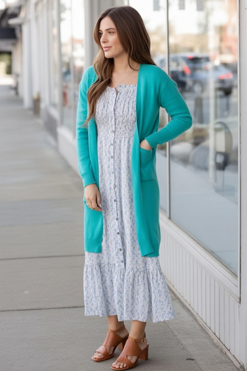 This pairing is such a mood booster: a breezy blue button-front maxi dress layered under a vibrant aqua cardigan. The softness of the print keeps it gentle, while the bold knit adds that little spark that makes people say, “You look so fresh today.” Neutral block-heel sandals keep the outfit grounded and walkable, making it ideal for spring errands, lunch dates, or a casual day at the office when you still want a little color.
