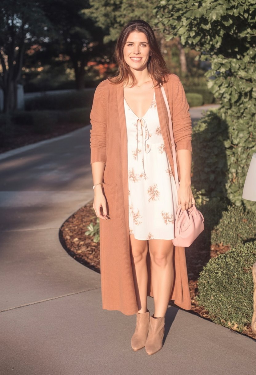 7. Long Cardigan And White Floral Mini Dress For Sunlit Strolls