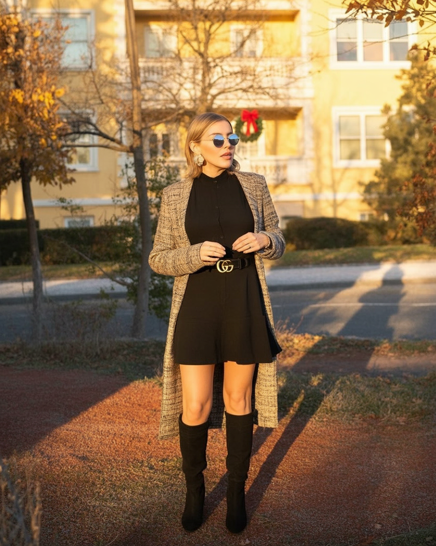 This outfit feels like a love letter to classic fall style: a softly patterned mini dress, a chunky cream cardigan, and tall brown boots that mean business. The cable knit adds cozy texture, while the warm tones of the dress bring a subtle retro mood. The longer cardigan length offers coverage without hiding your shape, and the high boots keep your legs warm but still very much on display. It’s the kind of look that turns a chilly day into an excuse to dress up a little.
