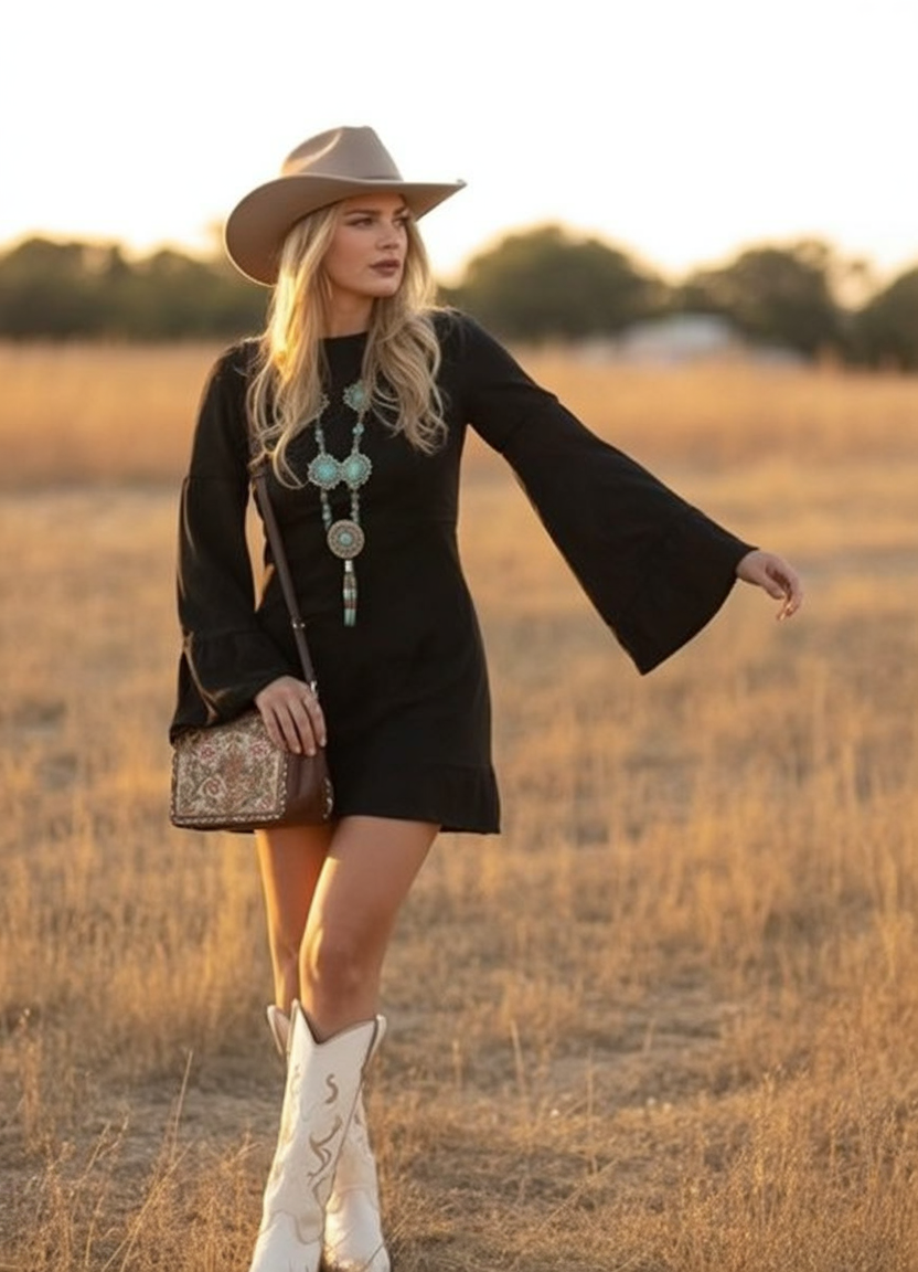 Here’s your 2026 response to the iconic little black dress: its 2026 interpretation is all about being sleek, dramatic, and ever-so-slightly wild. With its streamlined mini dress, those fabulous black bell sleeves are enough to steal the scene, while white Western-cut boots will instantly modernize the overall effect. Add some wild turquoise jewelry, like a big turquoise statement necklace, coupled with a straw fedora hat, and now you have party-ready looks for sipping drinks on the roof, listening to your favorite artists at sunset, or making a memorable yet not too dressed-up or played-out wedding guest appearance.