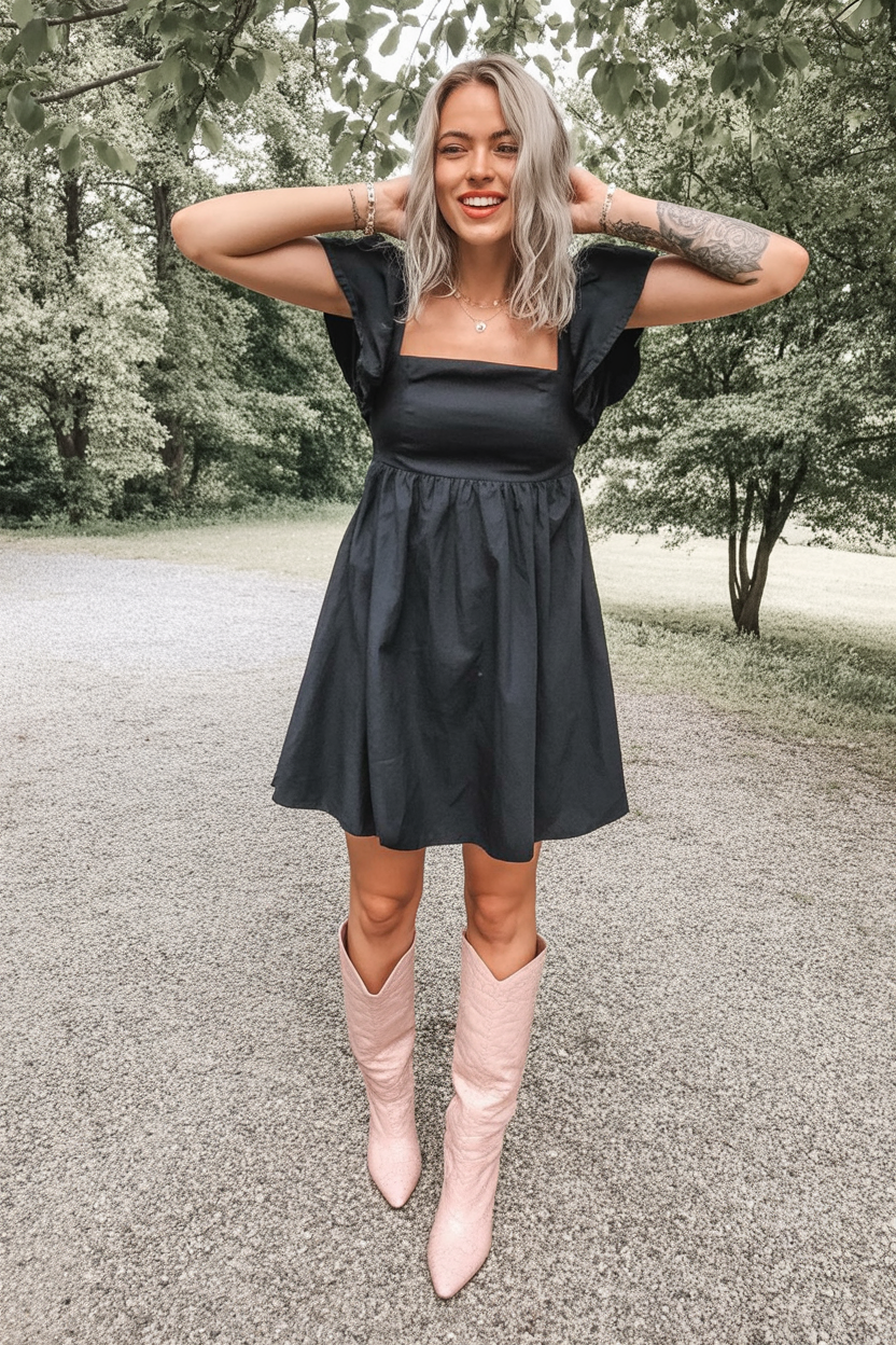 3. Square-Neck Black Dress With Soft Pink Boots