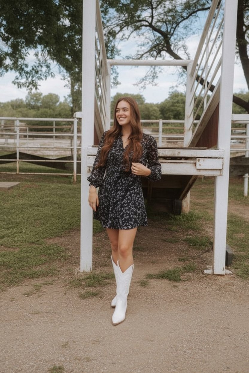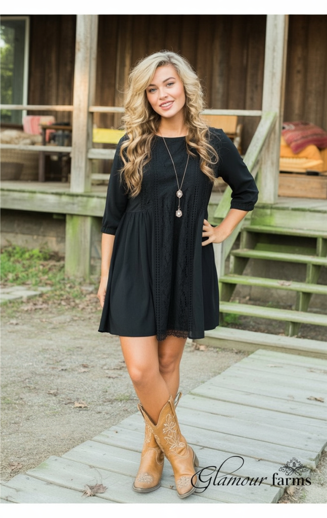What makes this pairing unique is how it balances city polish with rural ease. The dress could easily pass for a more formal piece if you paired it with heels, but the boots change the whole story, giving just the right amount of personality without sacrificing comfort. It’s a smart option if you’re dipping your toes into Western style and don’t want to invest in a whole new wardrobe—keep your favorite LBD and let the boots do the talking.