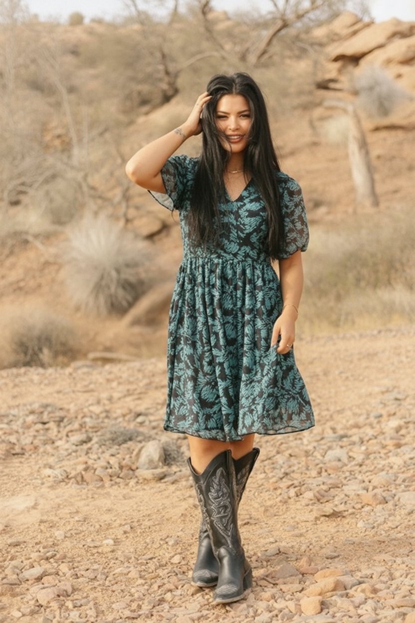 1. Teal Printed Dress With Classic Black Cowboy Boots