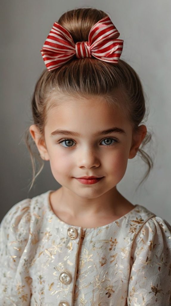 This sleek top bun adorned with a large striped red bow is a timeless classic. The hair is neatly gathered and secured into a high bun, creating a polished look perfect for formal occasions like weddings or family gatherings. The bun keeps the hair out of the face, highlighting delicate facial features and offering a sophisticated yet playful charm.