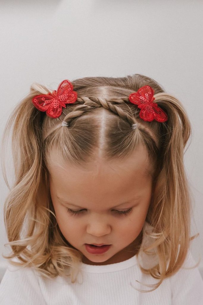 This adorable hairstyle features two braids accented with red butterfly clips, adding a touch of fun to any outfit. It’s a practical and playful option for school or casual outings.
