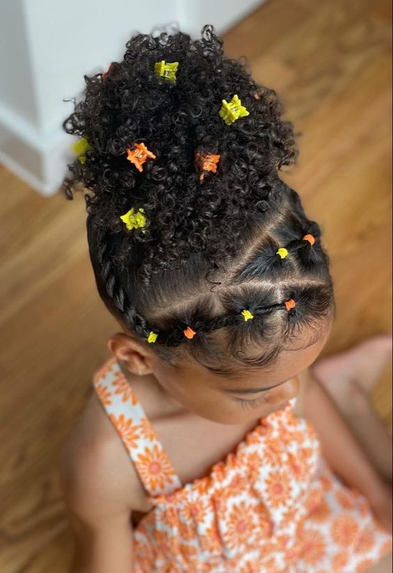 A voluminous curly puff accented with bright clips offers a playful and vibrant look. This style is ideal for black kids with curly hair, enhancing natural texture while keeping hair off the face.