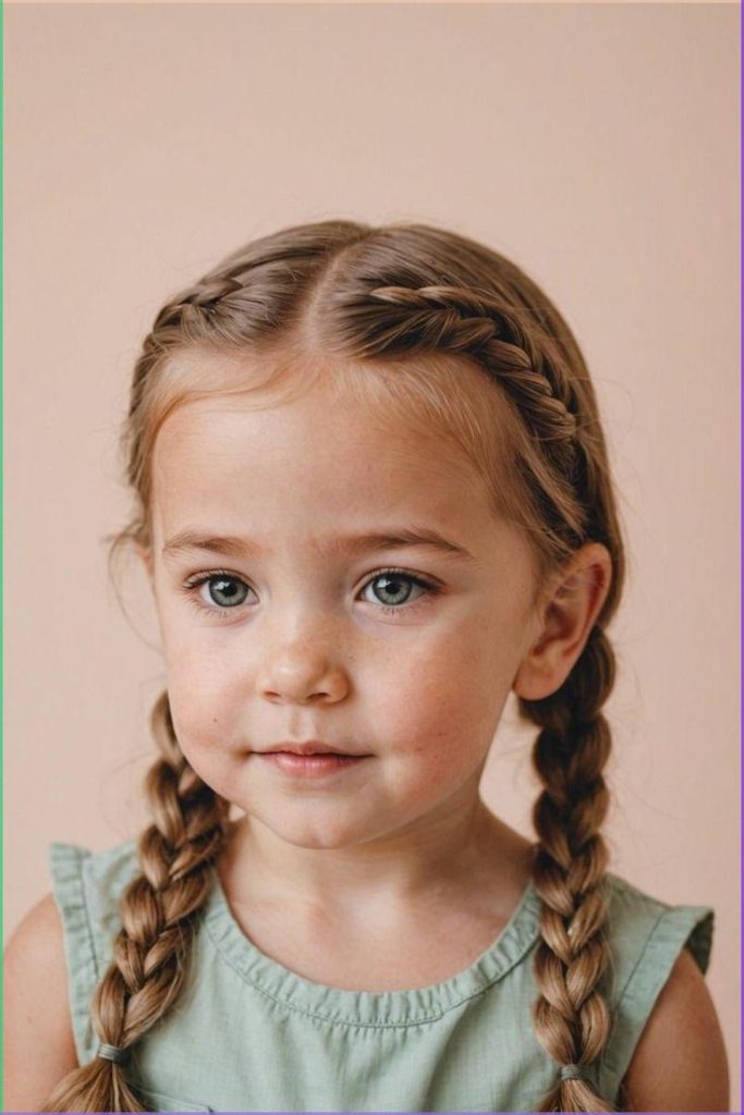 Part the hair down the middle and braid each side tightly, securing with elastics. This classic style is practical, easy to achieve, and complements any outfit, making it a go-to for busy parents and active toddlers.