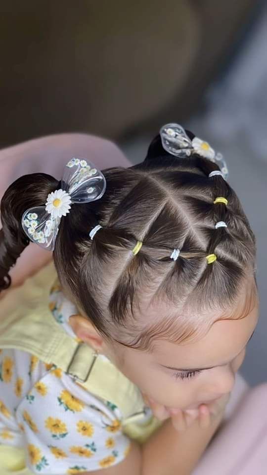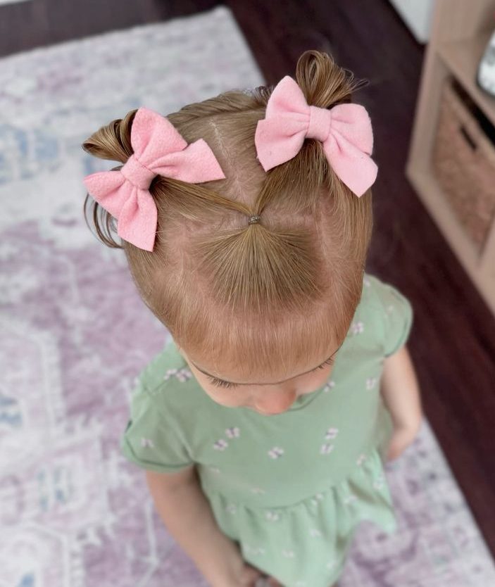 To recreate this look, use a fine-tooth comb to ensure clean parting. Secure each bun with elastic bands and wrap the hair neatly around the base. Add the bows for a polished yet playful finish. It’s a simple, easy hairstyle that’s both practical and adorable.