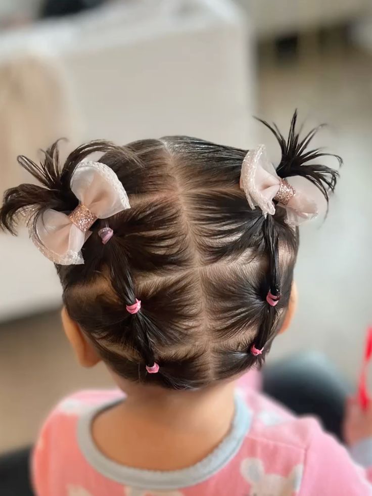To achieve this style, part the hair into multiple sections, tying each with small elastic bands in a crisscross pattern. Finish with a bright accessory like a bow for added charm. This look works wonderfully for thin hair, providing volume and dimension.