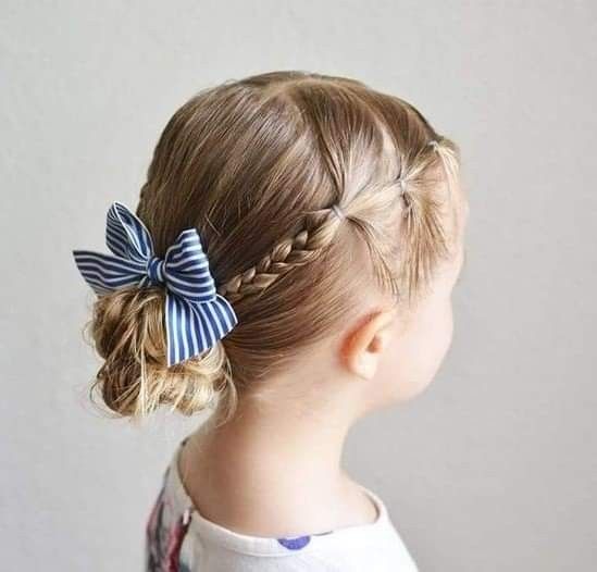 To recreate this look, part the hair down the middle and braid each side, stopping near the nape of the neck. Secure the braids with an elastic, then gather the remaining hair into a bun. Add a bow for a sweet finishing touch. This style suits fine hair and adds texture, making it ideal for toddlers with black braids or thin hair.